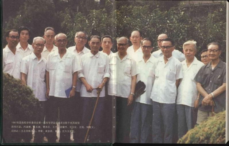 1981年国务院学位委员会第一届文学评议会成员合影于京西宾馆,前排左起:吕叔湘、朱东润、萧涤非、王力、钱钟书、王元化、王瑶、钟敬文;后排左二至左四依次为:李荣、吴世昌、夏鼐;左六为王起