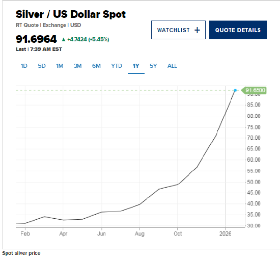 现货白银去年以 150% 的年度涨幅跑赢黄金,并在周二首次突破每盎司 90 美元。截至美国东部时间周三 05:42,现货白银价格上涨逾 4%,报每盎司 90.55 美元。